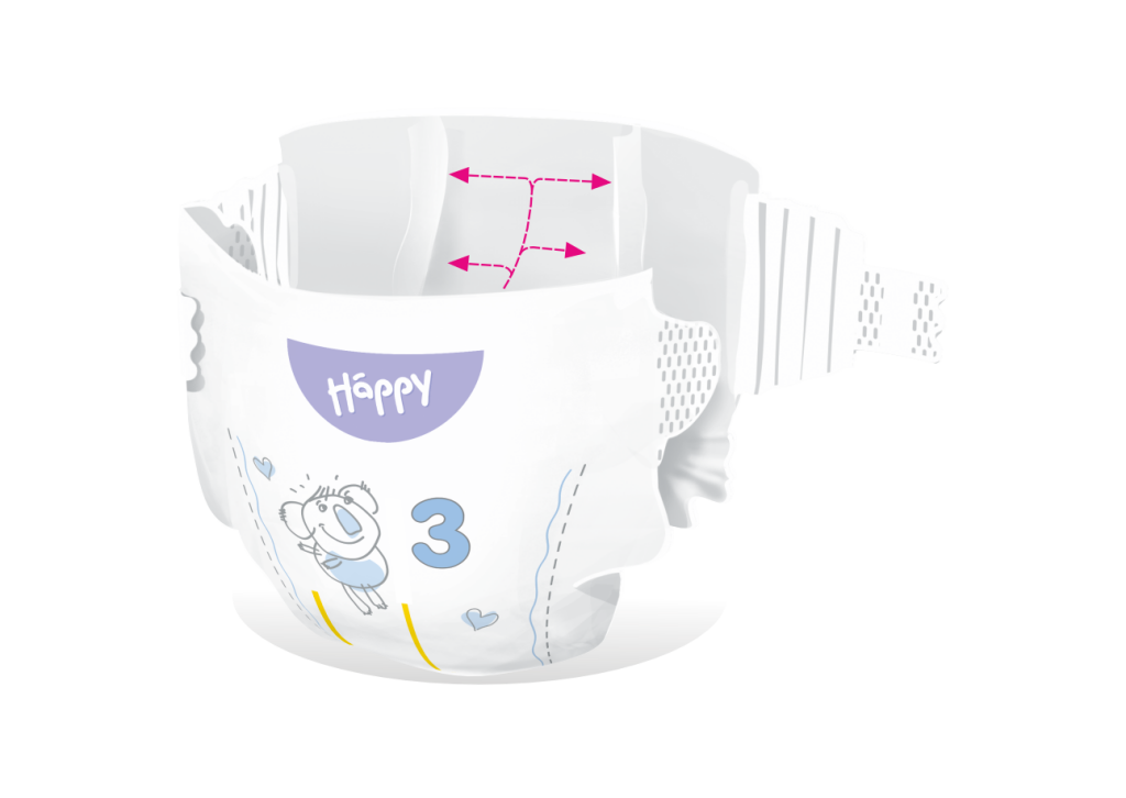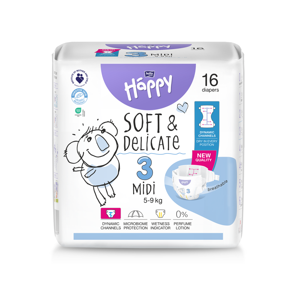 Dětské pleny Bella Baby Happy s kanálky Soft & Delicate 3 Midi (5–9 kg) jsou navrženy tak, aby poskytovaly maximální pohodlí a ochranu citlivé dětské pokožky.