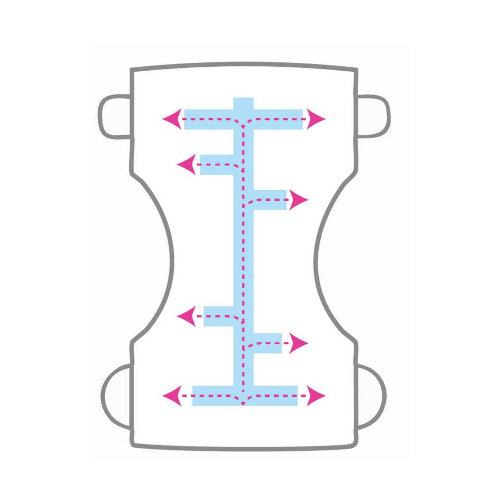 Elastické gumičky v pase se přizpůsobí tvaru těla a zajišťují pohodlné nošení bez otlaků. Boční elastické manžety pomáhají zabránit protečení a udržují obsah plenky uvnitř.