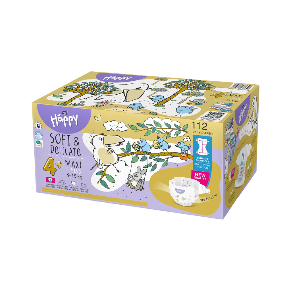 Bella Baby Happy dětské plenky s kanálky Soft & Delicate vel. 4+ (9-15 kg), Box 2 x 56 ks