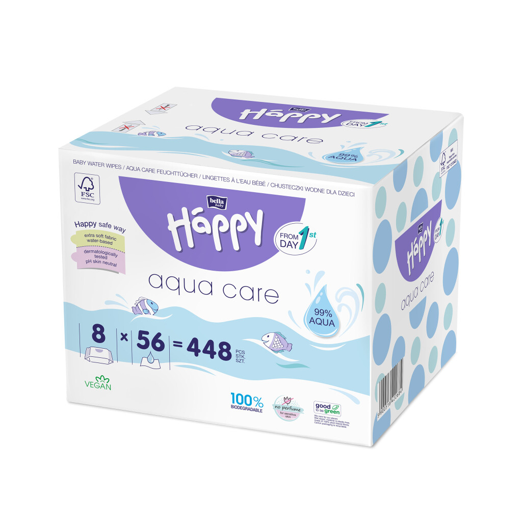 Bella Baby Happy dětské vlhčené ubrousky Aqua care multipack, 8 x 56 ks