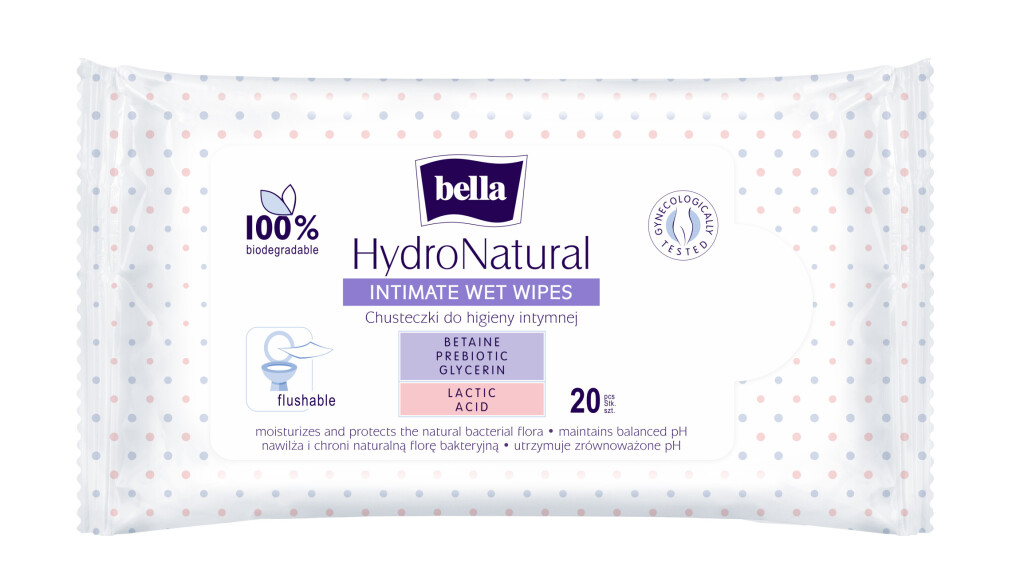 Vlhčené intimní ubrousky Bella HydroNatural jsou ideální nejen na cesty pro intimní hygienu. Obsahují betain, probiotika, glycerin a kyselinu mléčnou, které pomáhají udržovat přirozenou rovnováhu pokožky.