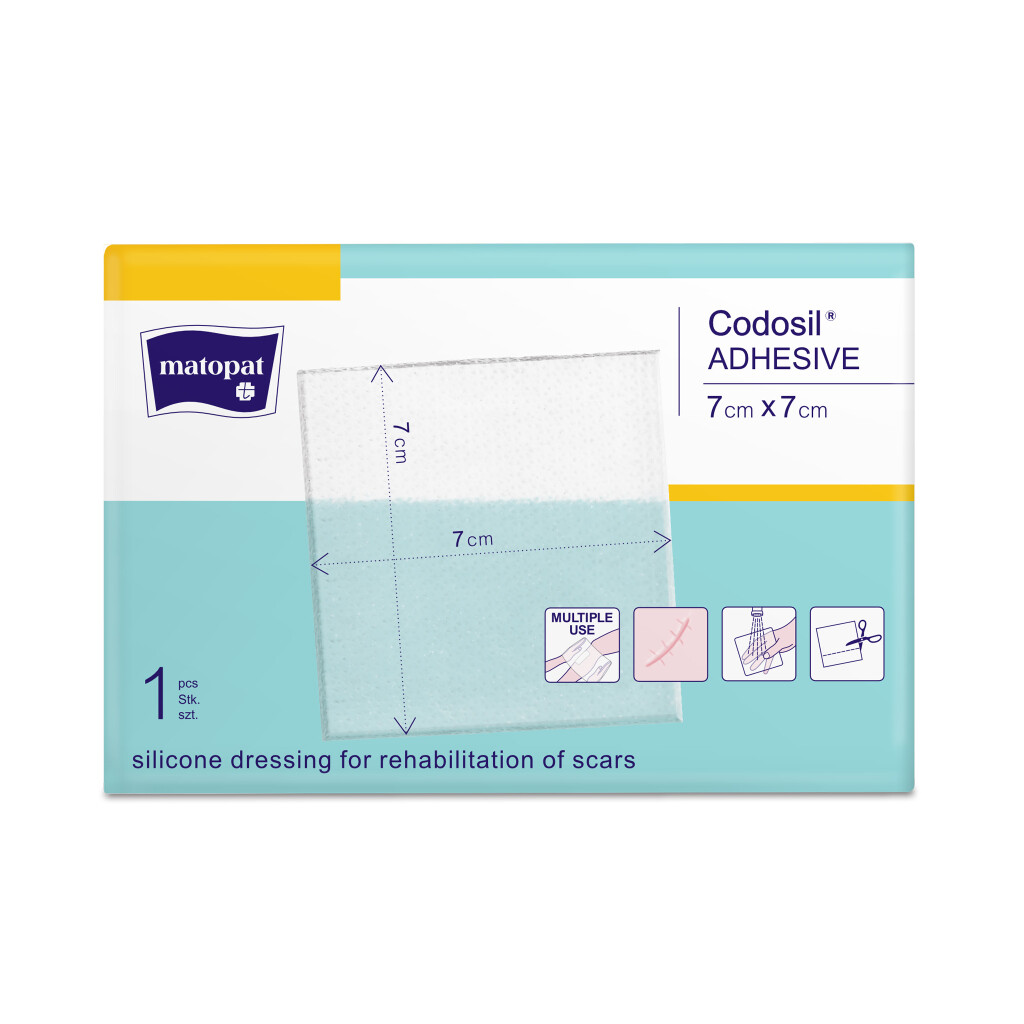 Matopat Codosil Adhesive je specializované silikonové krytí, které pomáhá redukovat a vyhlazovat jizvy po operacích, úrazech nebo popáleninách. Udržuje pokožku hydratovanou, snižuje svědění a napětí v místě jizvy.
