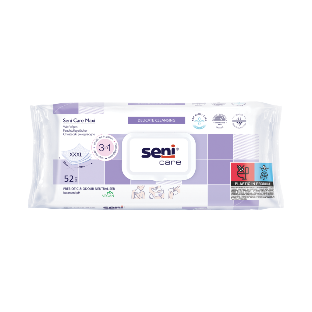 Seni Care Maxi vlhčené ubrousky jsou největší z řady Seni Care (25 × 30 cm) a umožňují rychlou a snadnou hygienu, zejména u osob s inkontinencí.