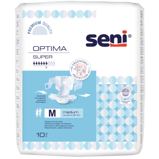 Seni Optima Super jsou prodyšné plenkové kalhotky s nastavitelným bederním pásem, který zajišťuje snadné zapínání a perfektní přizpůsobení tělu.