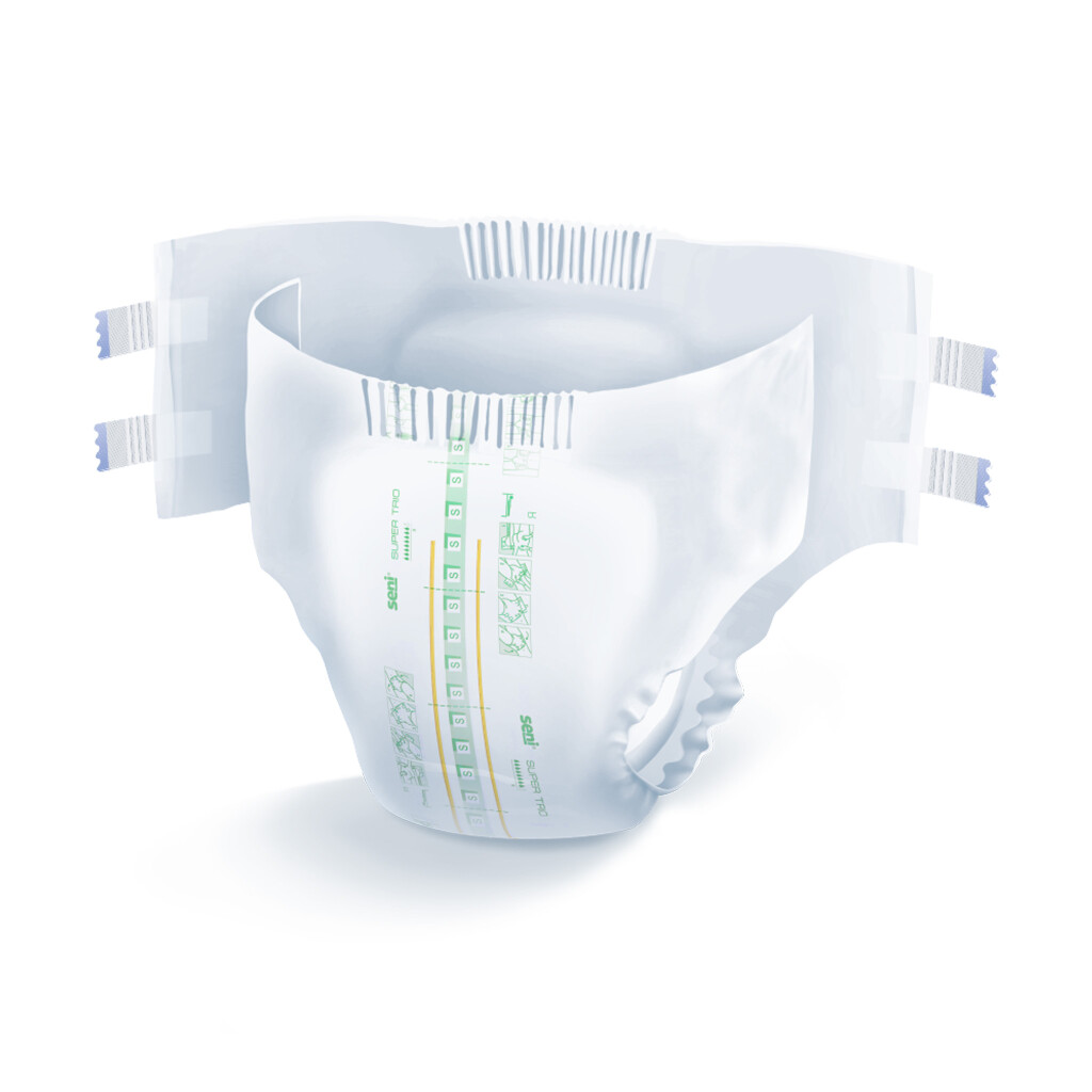 Seni Super Trio S jsou vysoce absorpční plenkové kalhotky s lepítky, které poskytují spolehlivou ochranu při těžké inkontinenci. Jsou ideální pro osoby s omezenou pohyblivostí i dlouhodobě ležící pacienty.